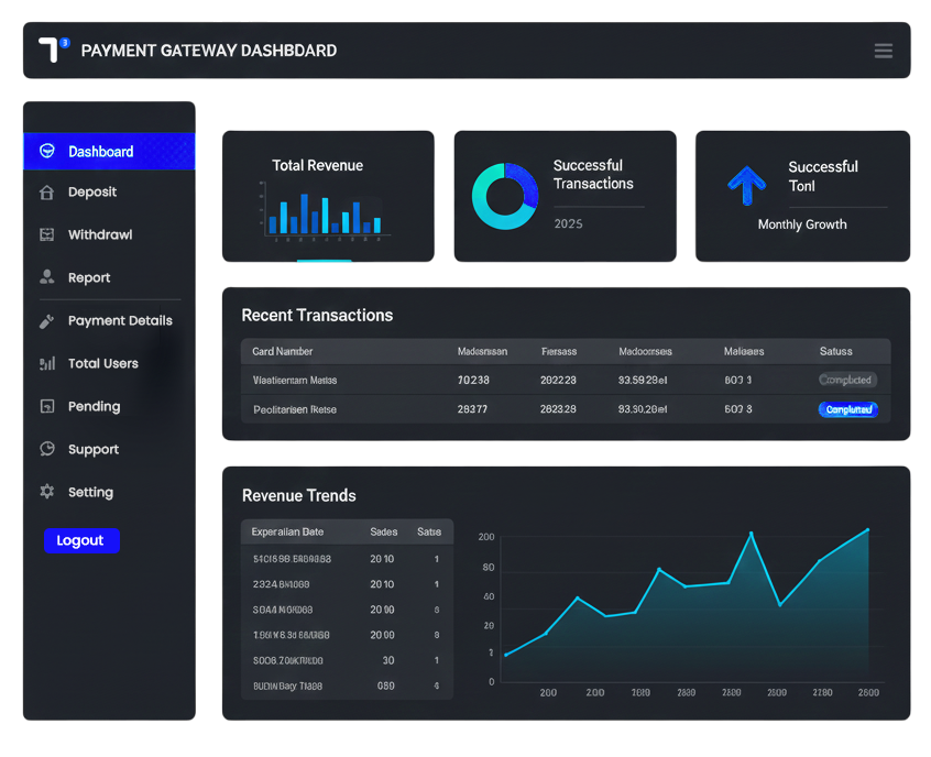 Our Payment Gateway Admin Dashboard is designed to give you complete control over every financial operation with speed, clarity, and precision. The intuitive dark-mode interface provides a seamless experience where admins can monitor key metrics, manage user transactions, and maintain full oversight of the platform’s financial flow. The clean sidebar navigation ensures quick access to all essential modules including deposits, withdrawals, bank details, crypto information, and system settings.